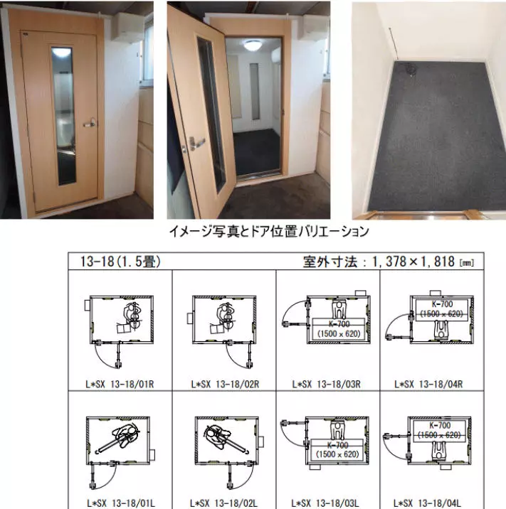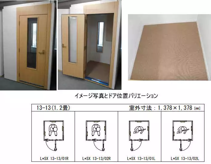 | 内装仕上 | ドア:木製防音ドア 床:タイルカーペット仕上げ 装備:スイッチ・2口コンセント ※照明器具はお客様の方でご用意してください。 |